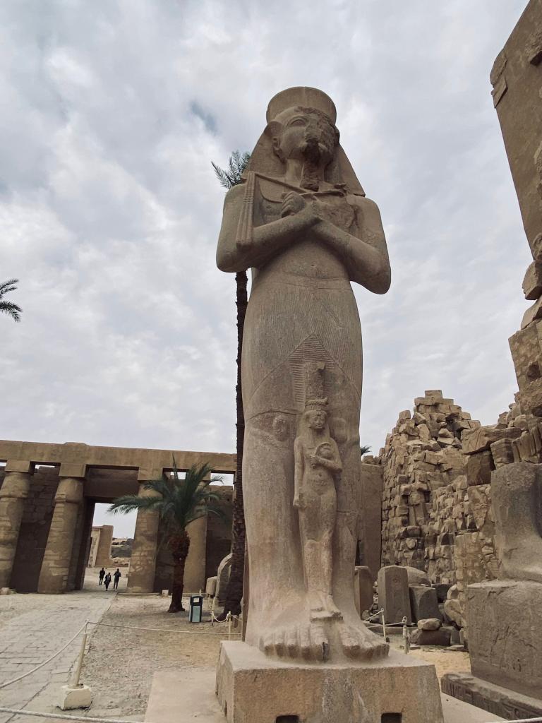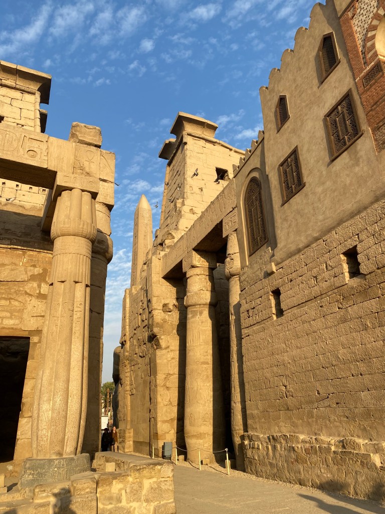 We started at Luxor Temple, built around 1400 BCE under the watchful eye of Amenhotep III, added to by Tutankhamun, and later Ramses II — whose massive seated statues still guard the grand pylon entrance. Unlike the funerary temples of the west bank, Luxor Temple wasn’t dedicated to death but to rejuvenation — a living stage where kings were crowned and reborn as gods in the flesh. Stepping through its colossal gateway flanked by a single obelisk (its twin famously stands today in Paris’s Place de la Concorde), you’re swallowed by a forest of papyrus-bud columns, colossal statues, and courtyards where priests once moved in flickering torchlight.