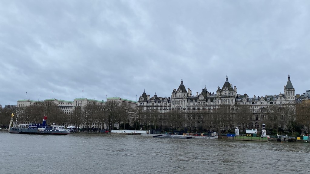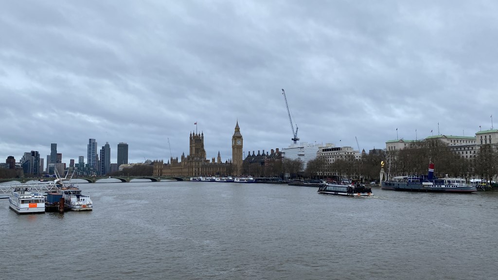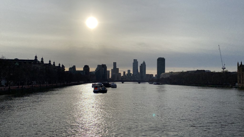 And if you happen to be by the Thames while the sun shines, the earlier muted blues are replaced by shimmers and elongated shadows cast by the riverside buildings.