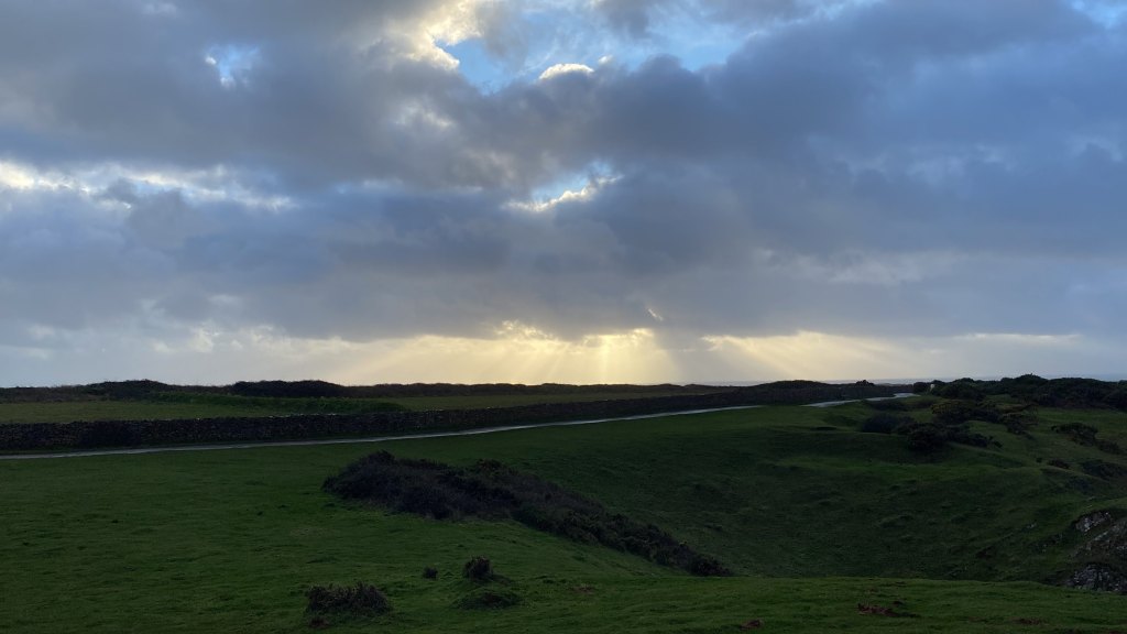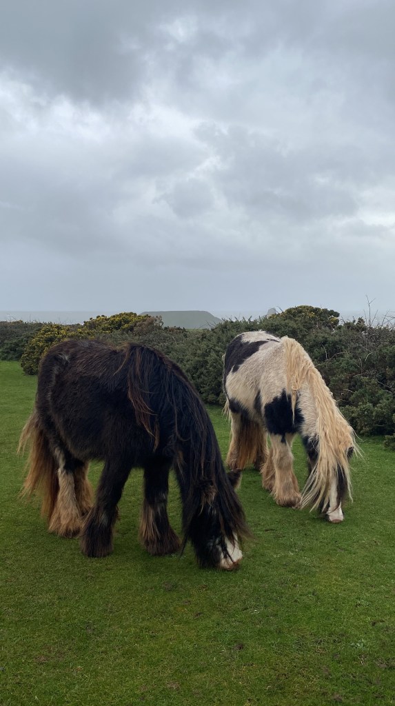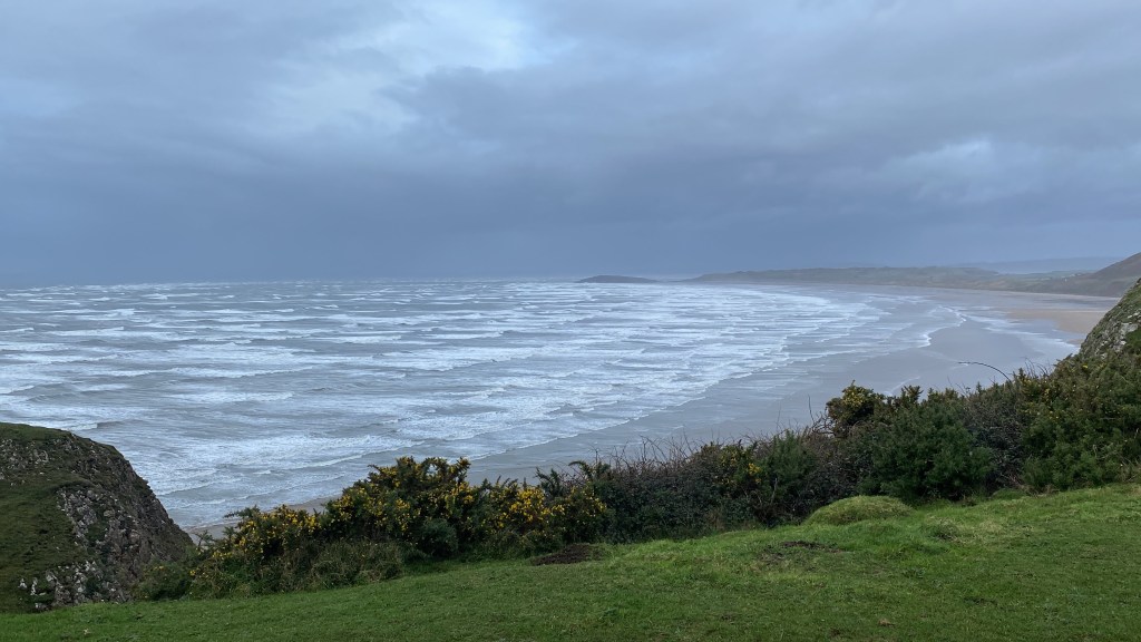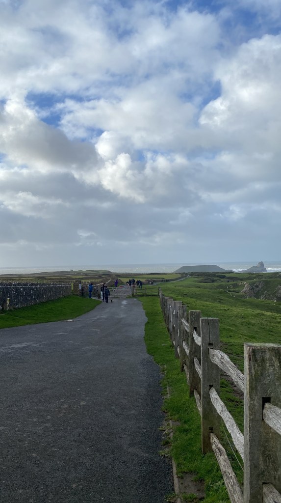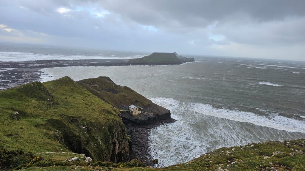So, as one ventures forth onto the narrow causeway leading to Worms Head, the first hint of the winds’ strength becomes apparent. The air carries a tangible sense of energy, vibrating with the invisible force that shapes the landscape. With each step, the sound of the ocean grows louder, a constant roar that serves as a reminder of the vast expanse of water that surrounds the island. The on and off rain intensifies, veiling the horizon in a curtain of silver. Clouds gather overhead, swirling and shifting with each passing moment, casting dramatic shadows upon the landscape below. And once the rains have ceased, albeit only for a short while, the sun shines and the vibrant hues of green to emerge from the earth and adorning the cliffs with shimmering rivulets of water.