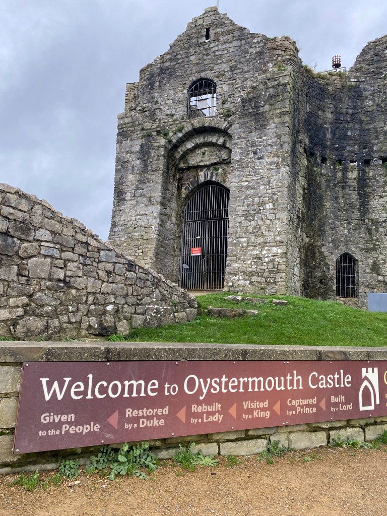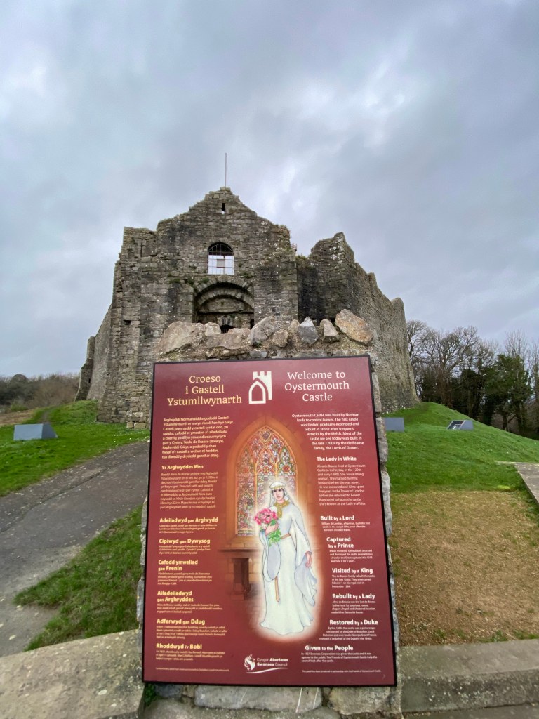 Oystermouth Castle, standing proudly atop a rocky hill overlooking the village of Mumbles and Swansea Bay, presents a striking silhouette against the backdrop of the Welsh coastline. From the outside, the castle’s rugged and weathered walls tell tales of centuries past, evoking a sense of mystery and history. Adding further to the mystery is the popular legend of the “Lady in White”. According to local folklore, the Lady in White is said to be the ghost of a woman who haunts the castle grounds, appearing as a spectral figure dressed in flowing white robes. And whilst we were circling the castle, I couldn’t help but imagine a rather disastrous sudden encounter with the beautiful lady in white.