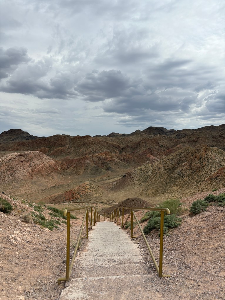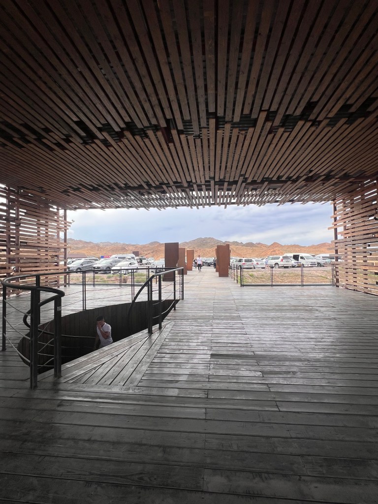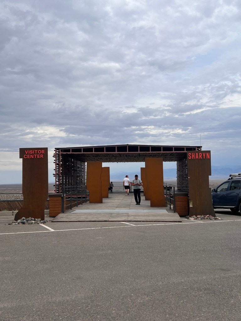 The entrance to the Valley of Castles part of Charyn Canyon is a simple gate and a visitor center with maps and information about the area. The landscape around the entrance is already breathtaking with panoramic views of the vicinity. The road to the entrance is paved all the way to the viewpoint, and then a winding staircase which looks like it is carved into the rocky terrain leads you down into the valley.