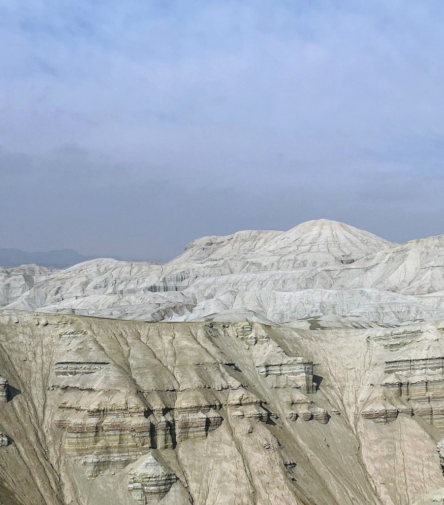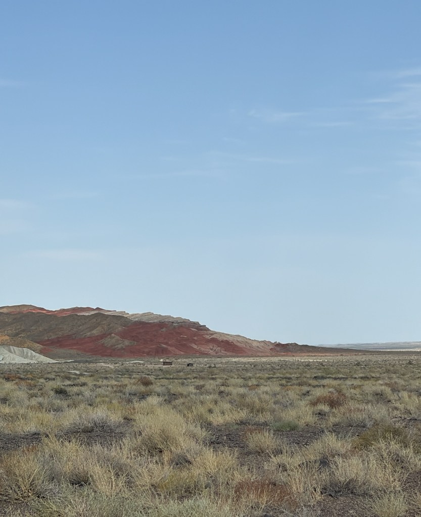 “Aktau” means white mountains in Kazakh. But in fact they are multi-coloured. An entire stretch of white, grey mountains and reddish brown and even yellow mountains, guarding the barren scape.