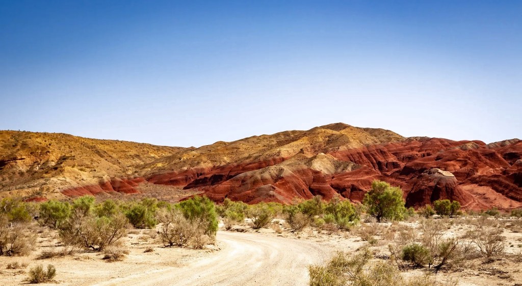 The surface of the mountains is devoid of any vegetation except for the rare bushes and shrubs which stand in contrast against the red slopes. There is no sign of water anywhere. Just untouched and wild.