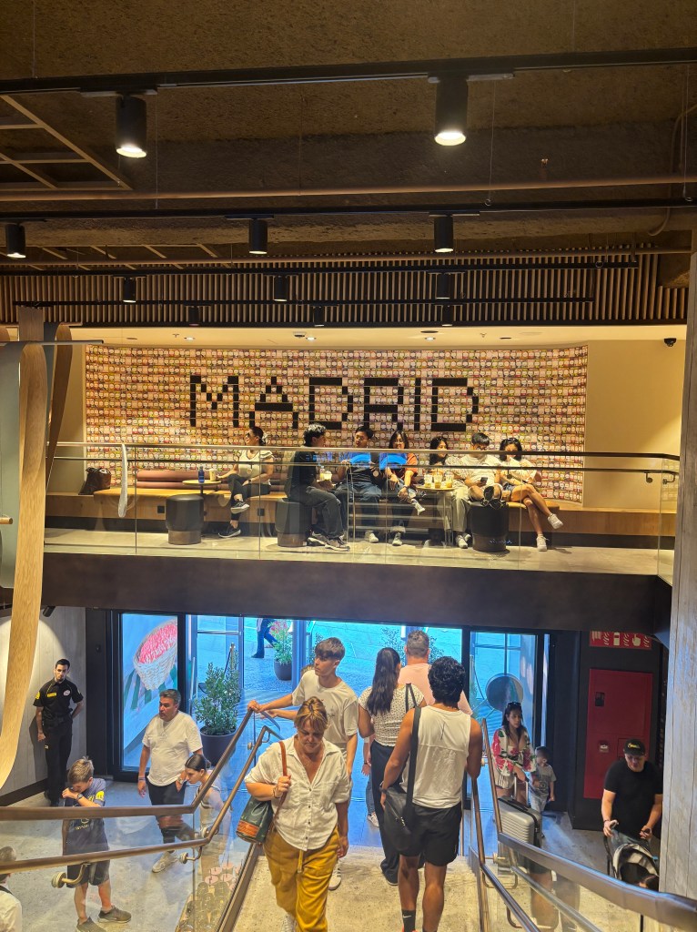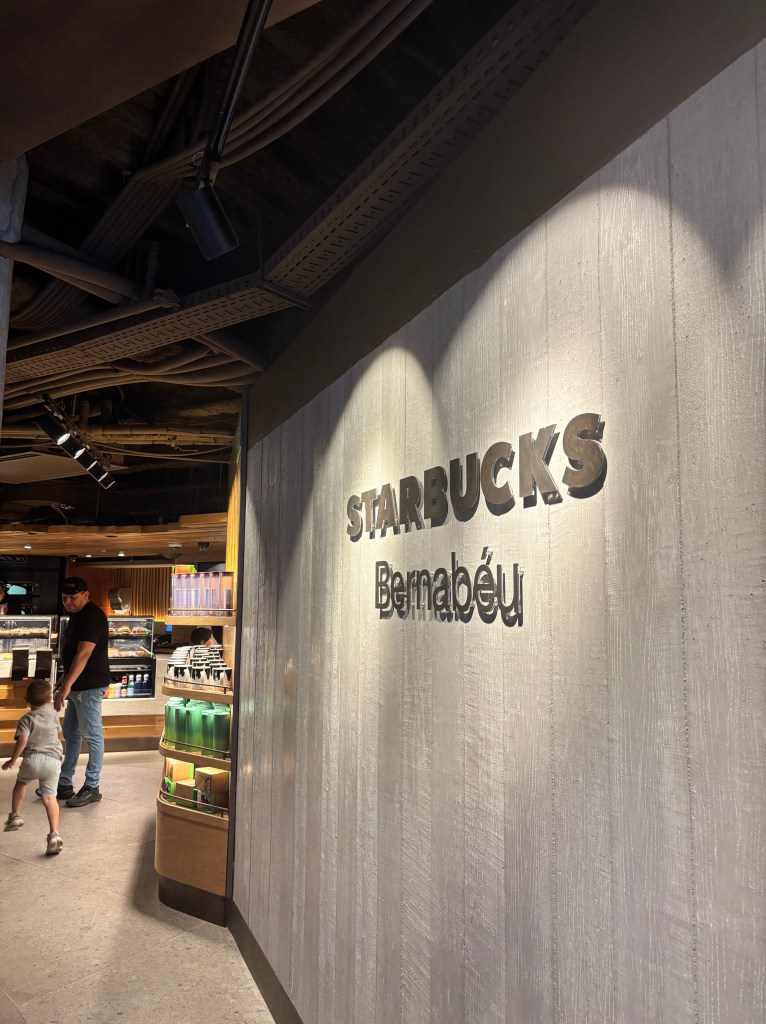 My husband’s a huge football fan, so I called him from outside the stadium – a little virtual tour of sorts. I walked him around on video, showing him the grand facade before wandering into the Starbucks tucked next to the Bernabéu complex – two floors, warm lighting, beautiful design details – and the big surprise: an upper-level lounge with full glass views into the stands.